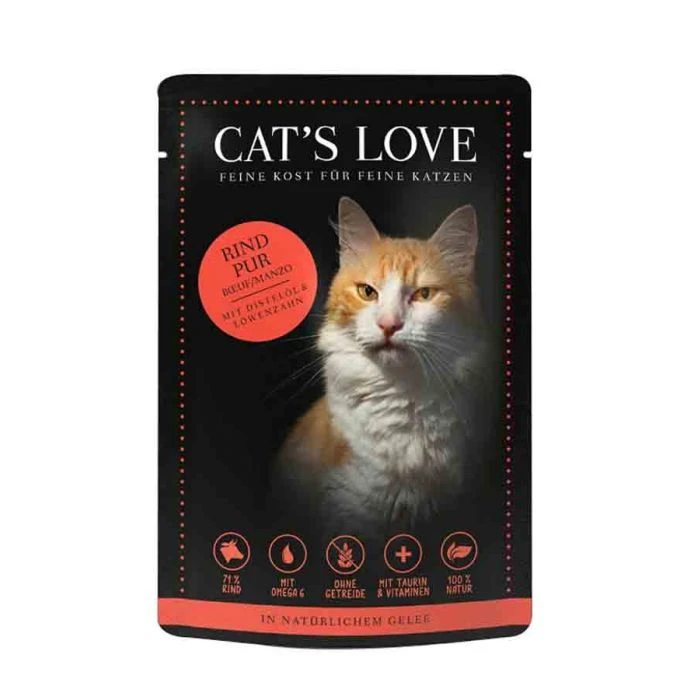 Le bustine fresche CAT’S LOVE con manzo sono realizzate con olio di cartamo e tarassaco. Queste bustine di freschezza 100% naturali sono prive di cereali e forniscono un pasto completo per il tuo gatto.