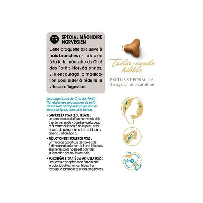 Questa esclusiva crocchetta a tre punte è adattata alla forte mascella del gatto delle foreste norvegesi. Favorisce la masticazione per ridurre la velocità di ingestione.