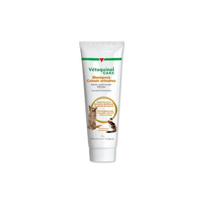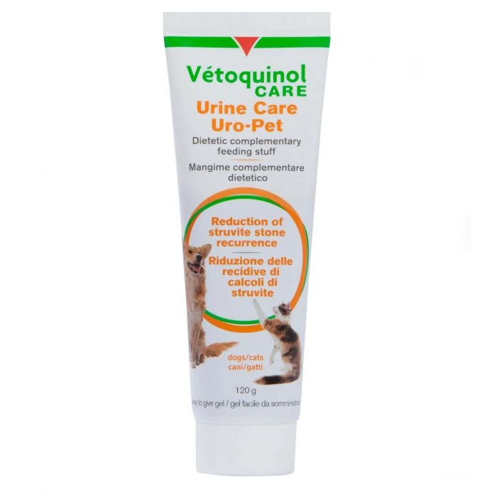 Calcoli renali di Vétoquinol Care è un gel a debole tenore in magnesio avente un effetto acidificante sulle urine. Grazie al suo pratico tubo, questo prodotto contro i cristalli urinari è di facile impiego.