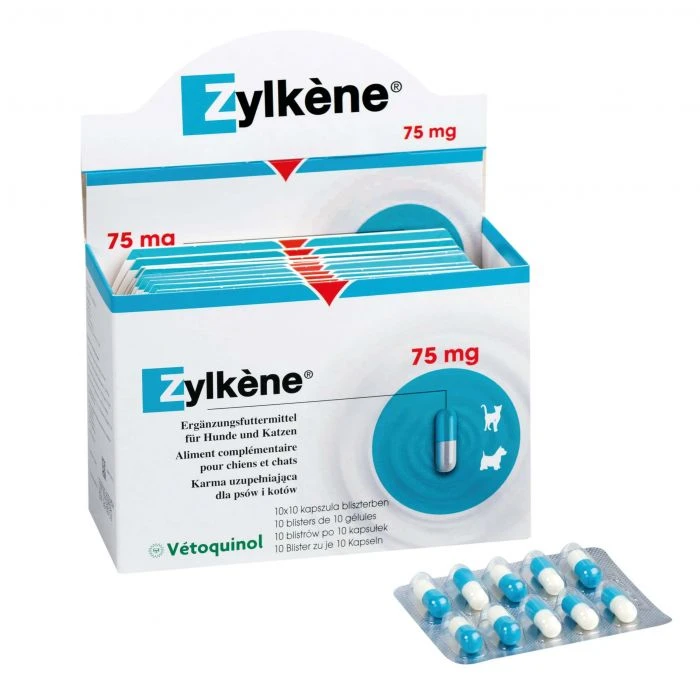Zylkène è disponibile in barattoli da 30 capsule oppure nelle nuove scatole da 20 capsule in blister nelle 3 referenze 75 mg, 225 mg e 450 mg, in base al peso dell’animale.